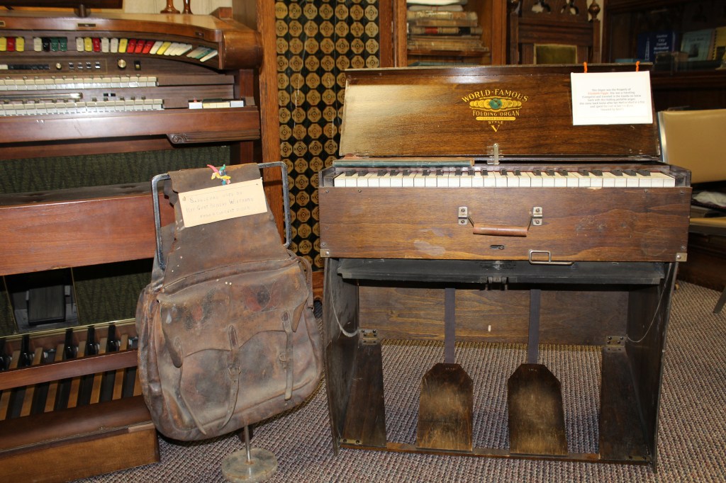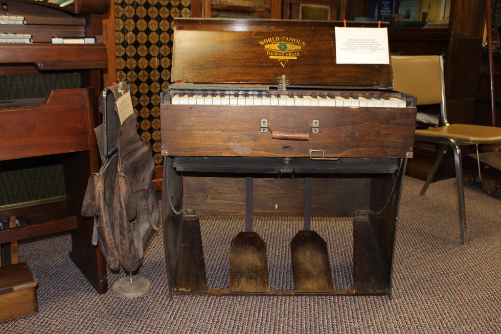 This organ was the property of Elizabeth Figgie. She was a traveling Evangelist and traveled in the Ozarks on horse back with this folding portable organ. She came back home after her mother died in a fire and spent the rest of her life there. Donated by family.